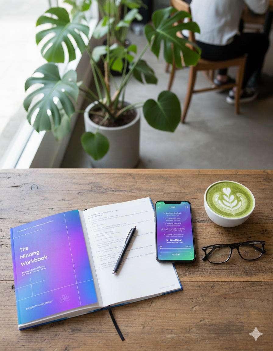 The Minding Workbook and the Minding App work in tandem to bridge the gap between "trying" to meditate and "being" a meditator.